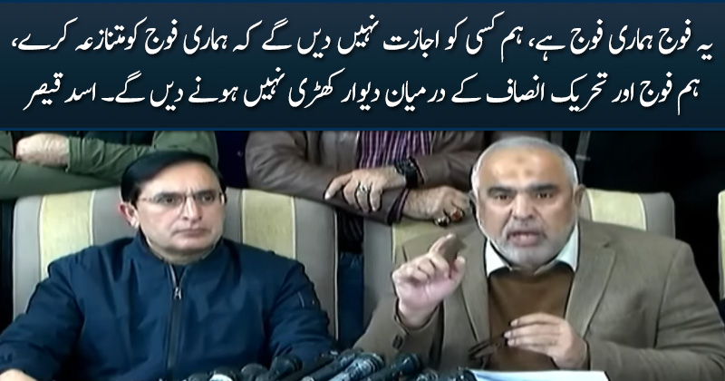 یہ فوج ہماری فوج ہے، ہم کسی کو اجازت نہیں دیں گے کہ ہماری فوج کومتنازعہ کرے، ہم فوج اور تحریک انصاف کے درمیان دیوار کھڑی نہیں ہونے دیں گے۔ اسد قیصر